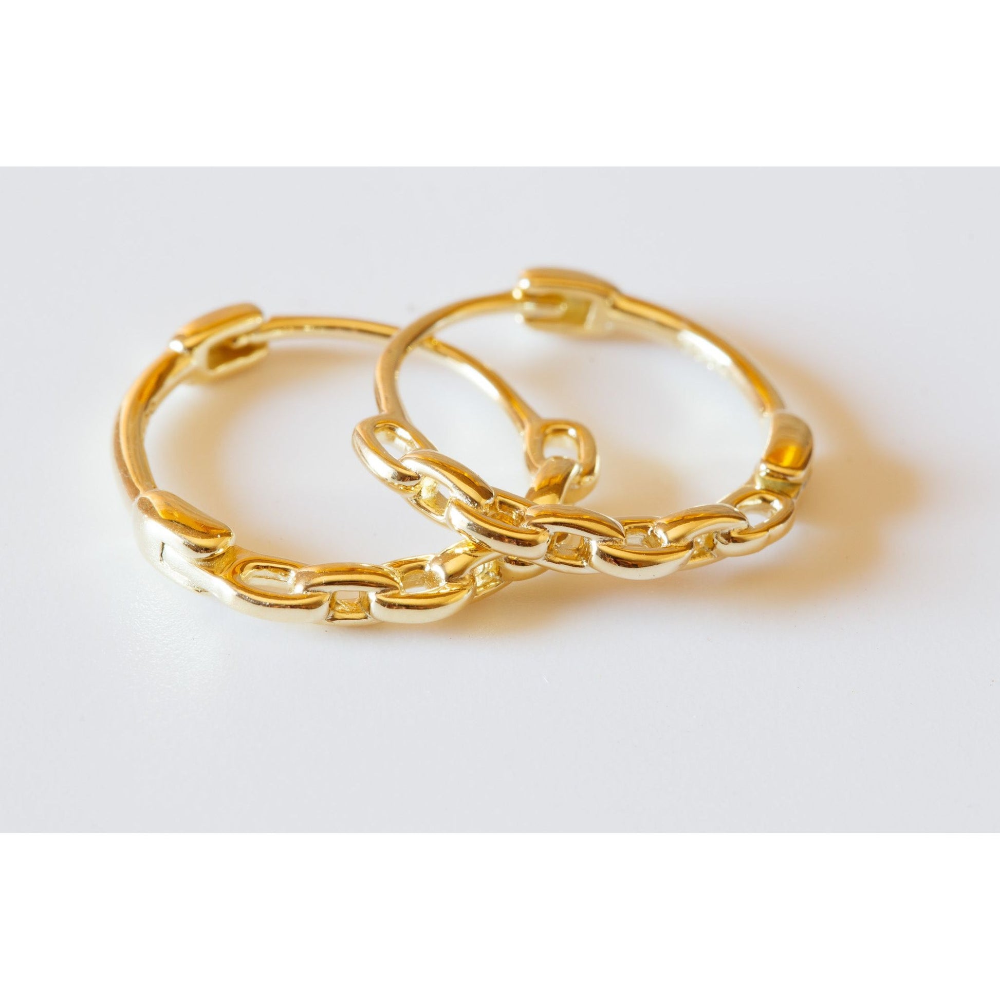 "Add a touch of edgy elegance with our Chain Hoops! These gold plated earrings feature a unique chained design and 18mm diameter for a subtle yet stylish statement. Perfect for anyone looking to stand out from the crowd with a hint of playfulness."