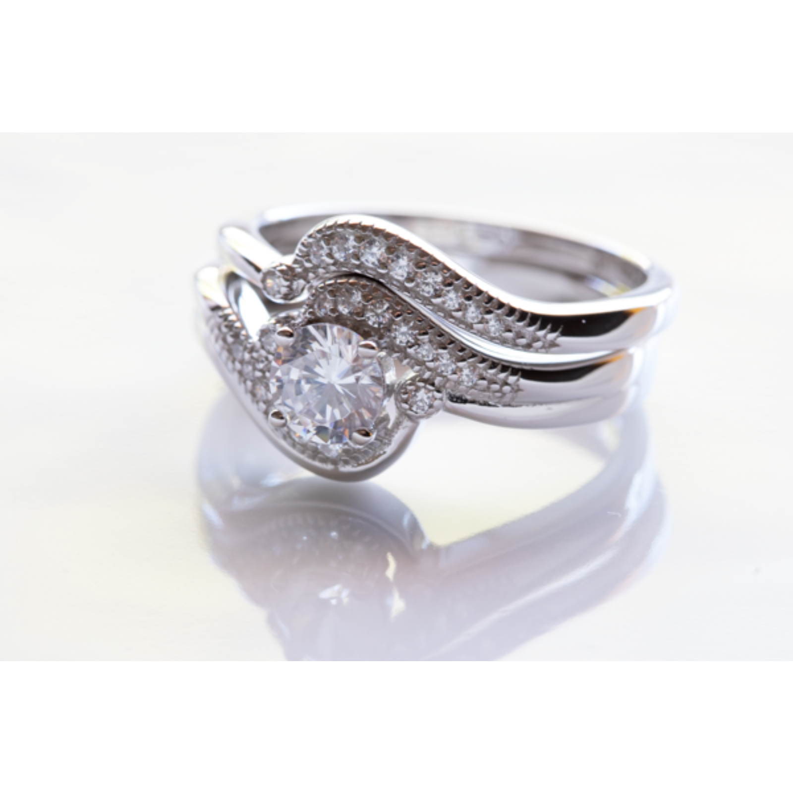 This Angel CZ Wedding Set will make a perfect addition to your special day. Crafted in sterling silver with sparkling cubic zirconia stones, the engagement ring features a larger stone in the center for added elegance, accompanied by a wedding band featuring smaller stones. A timeless, unforgettable piece.
