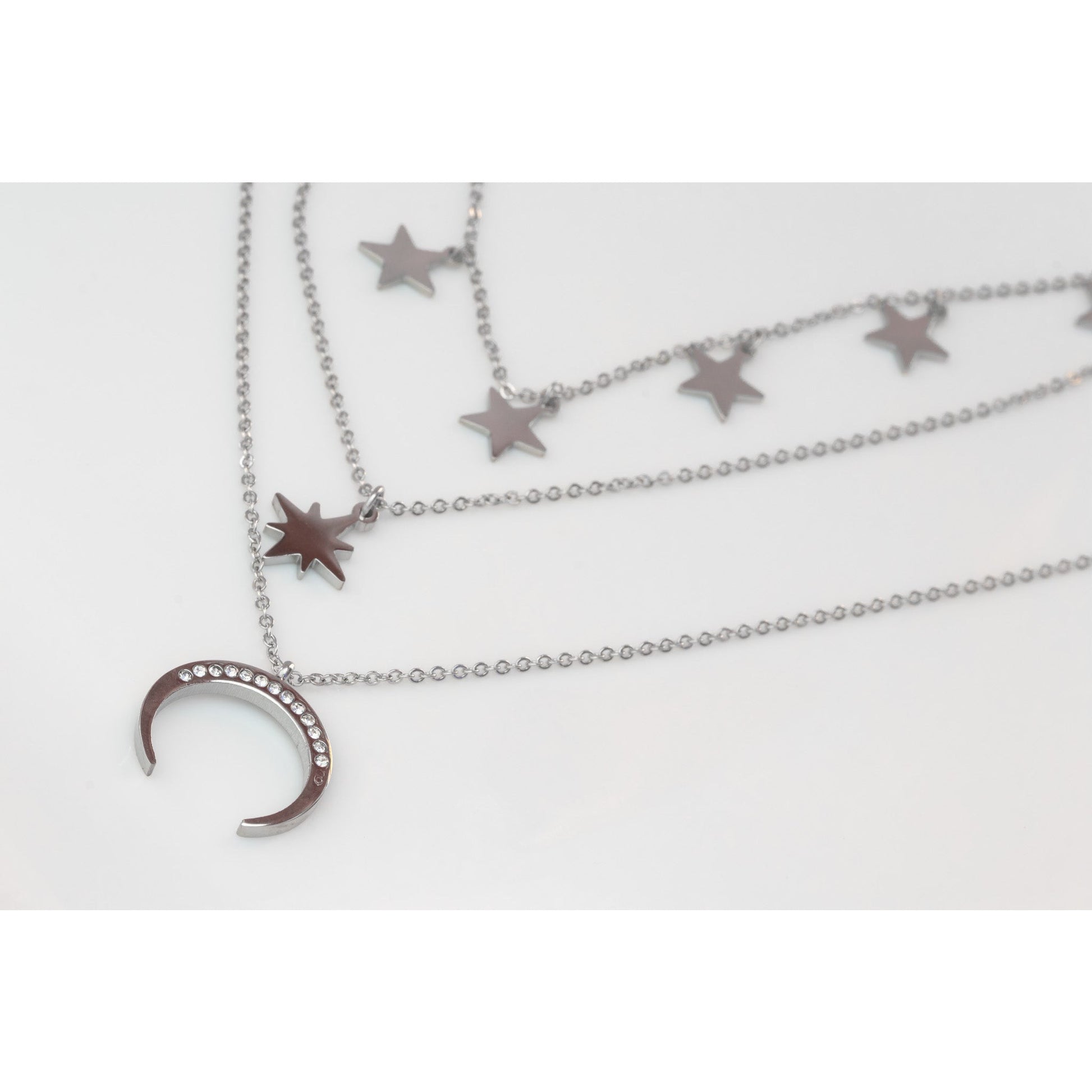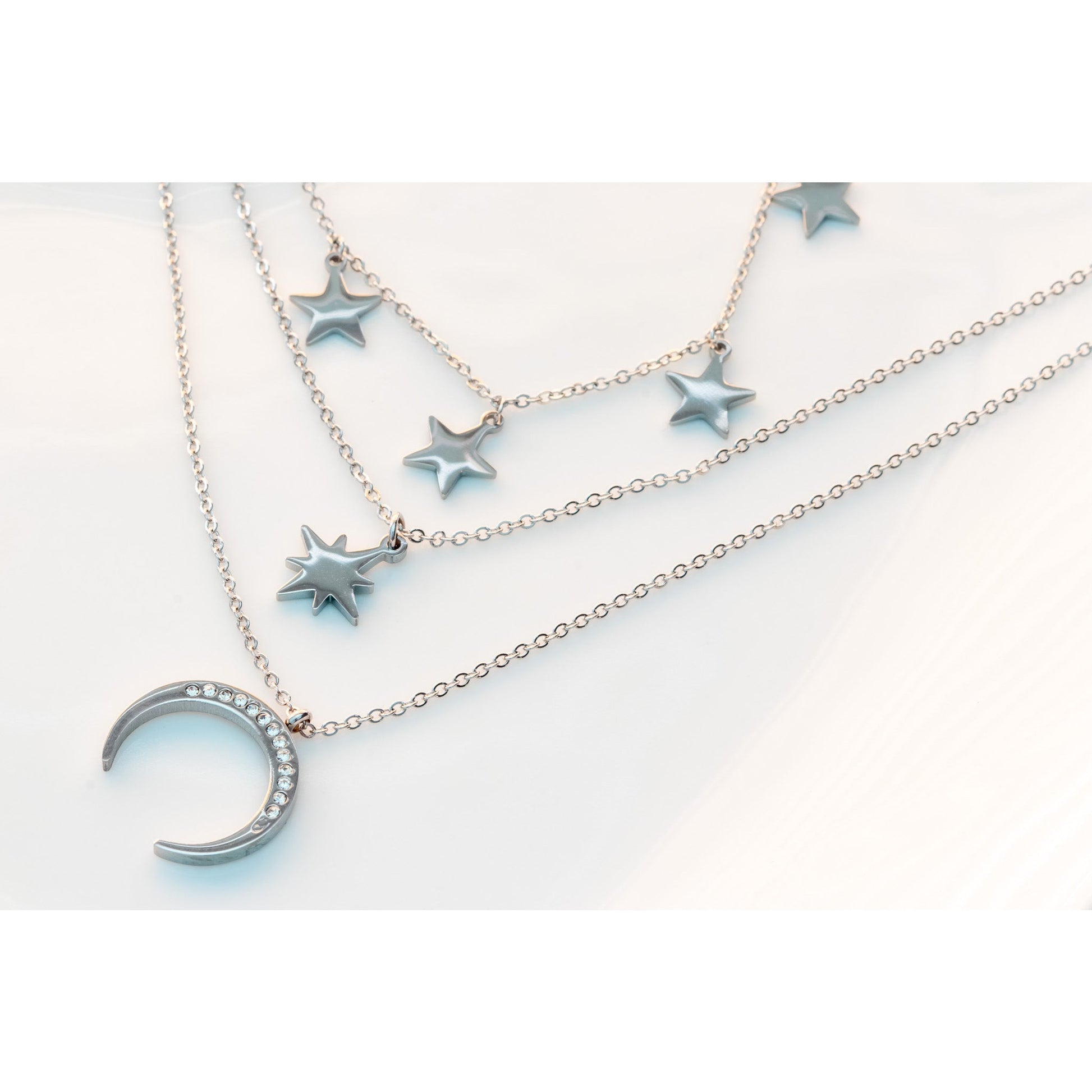 Our Three in One Stainless Steel Half Moon and Stars necklace is a stylish piece of jewelry that will make a statement. Made from high-quality materials, this necklace offers an elegant and sophisticated look. With its modern design, this necklace is perfect for any occasion.