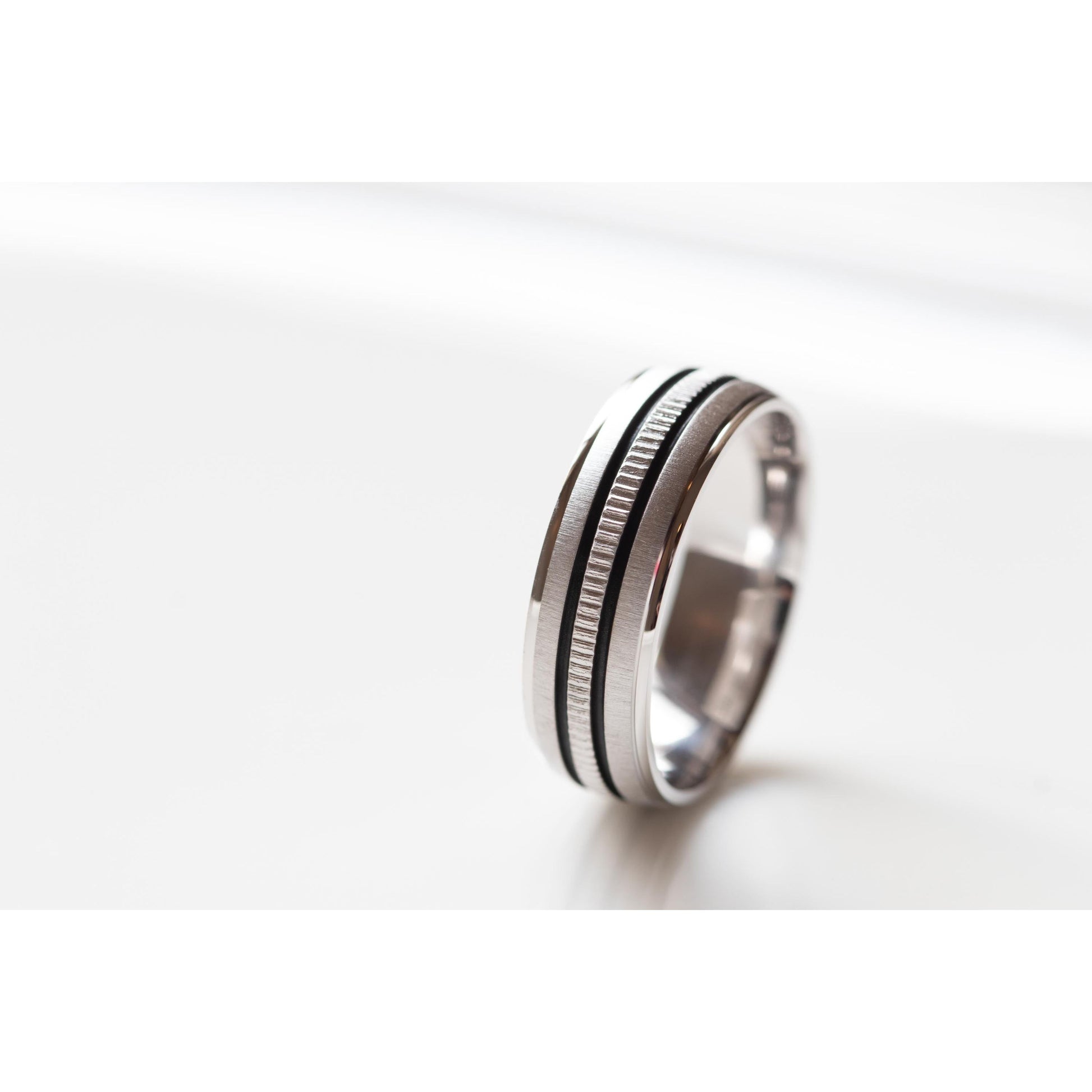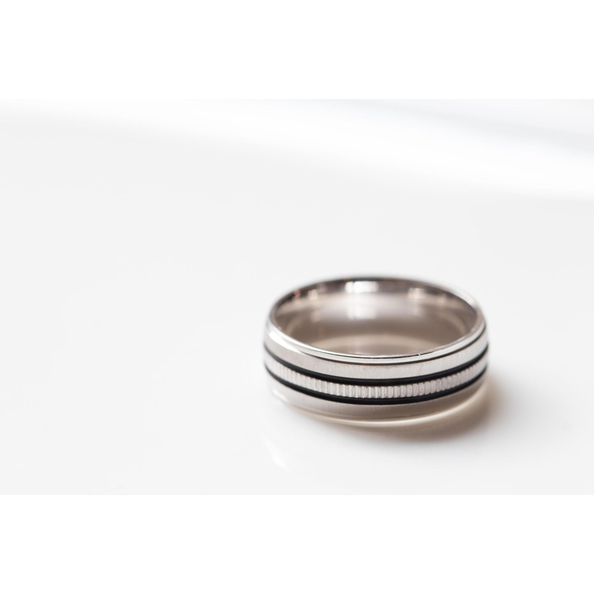 Peter is a sophisticated two groove, beveled edge 7mm wide Sterling Silver Wedding Band with two thin black inlays and a matt finish.