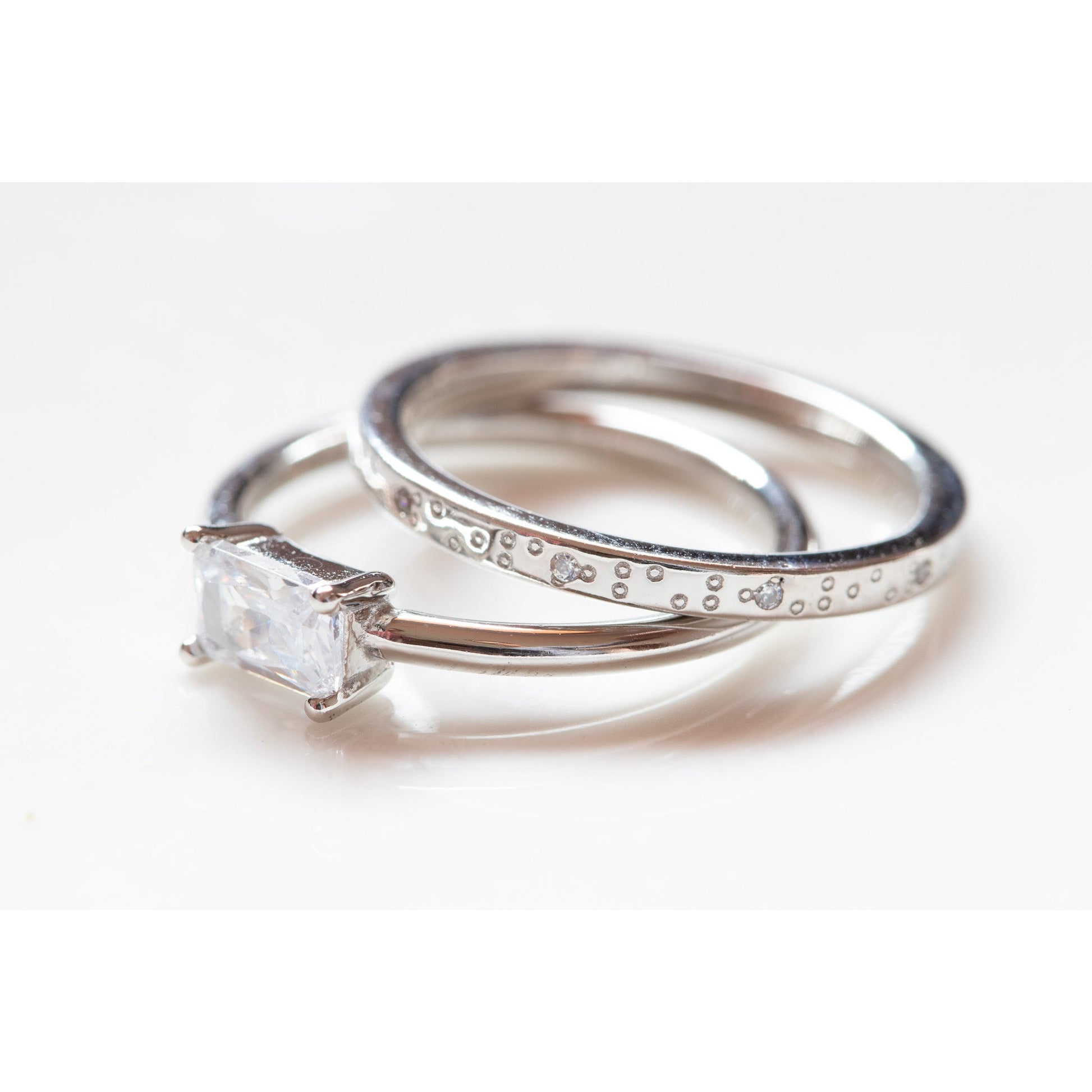The Tammy Wedding Set is a timeless accessory crafted from sterling silver and featuring an eye-catching single square cubic zirconia. This sophisticated set is ideal for completing any wedding look.